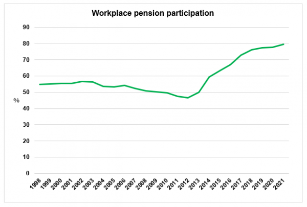 The success of automatic enrolment was recently underlined by a new set of data from the Office for National Statistics (ONS). As the graph shows, once the gradual introduction of automatic enrolment started, the proportion of eligible workers in workplace pension schemes steadily rose from 46.5% in April 2012 to 79.4% in April 2021.