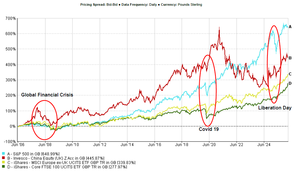 The chart above shows the major global equity indices (US, China, Europe and UK) going back to 2007. This long-term perspective illustrates an important truth: even major global shocks eventually become small blips on a long-run chart. Investors who stayed the course throughout these periods were consistently rewarded.